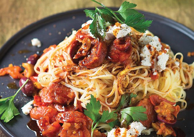 If you use the cured kind, this pasta goes even quicker – all you need 120 g chorizo. Slice and toss through al dente linguine, with green olives, chilli and Rosa tomatoes, find the recipe here.