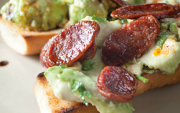 Pan-fry 200 g sliced chorizo in olive oil for 2 minutes on each side side, or until golden and slightly crisp. Mash some avo and smear on a freshly toasted French loaf and top with the chorizo.