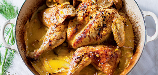 The tang of the orange zest and juice is grounded by the earthiness of the fennel making for all-round amazing flavour. Thinly slice 1 fennel bulb, then place the fennel, 2 crushed garlic cloves and 2 thinly sliced orange rinds into the roasting pan along with the whole chicken. Try the fennel-and-orange roast chicken with sweet potato crisps recipe here.