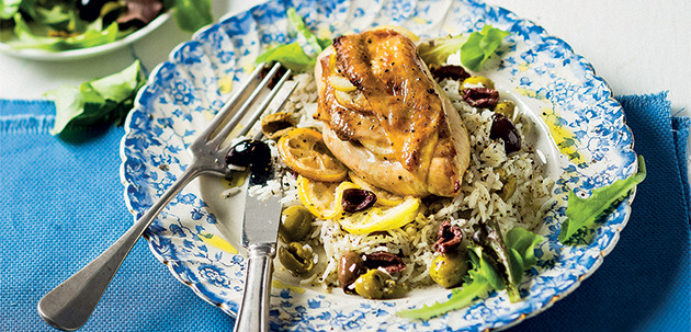 Place 1 thinly sliced lemon under the skin of 3 or 4 chicken breasts, season to taste with sea salt and freshly ground black pepper (if you have extra lemon slices place them under the breasts on a baking tray and grill. Find the lemon-grilled chicken with olive rice recipe here.