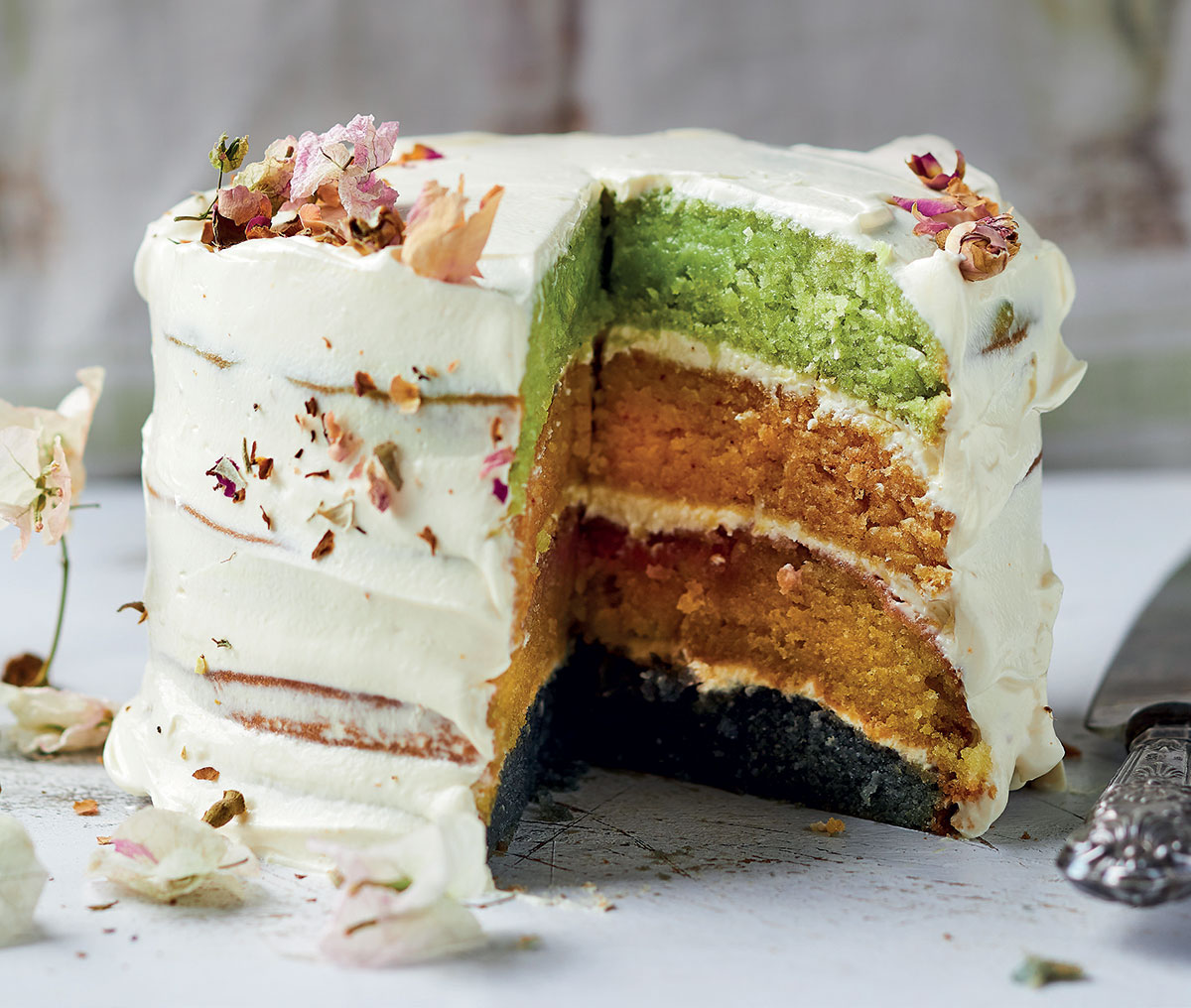 Raspberry, carrot, turmeric, spinach, blueberry and beetroot create the subdued shades of this rainbow cake.