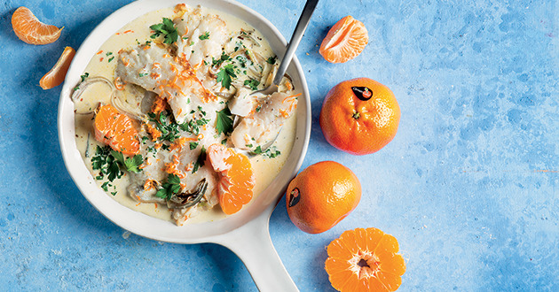 Soften 1 sliced shallot in 2 T butter in a pan. Add the juice and zest of 2 ClemenGolds and 2 fillets of hake or kingklip. Cover and poach for 10 minutes, or until the fish is cooked. Plate the fish. Bring the pan juices to a boil and reduce by half. Add 2 T chopped parsley and season to taste. Stir in 1⁄2 cup cream and gently heat without boiling. Pour the sauce over the fish and garnish with the zest of another ClemenGold and Italian parsley.
