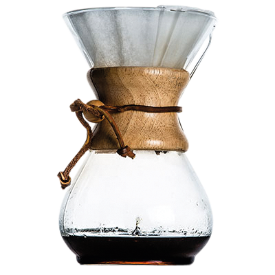 The hourglass-shaped Chemex dripper with its distinctive wooden collar brews coffee by means of a paper filter inserted into the neck of the flask. Add ground coffee and “bloom” it by moistening with a little hot water. Then pour over the desired quantity of water (for your number of cups) and let it percolate into the flask.