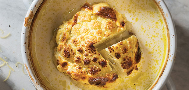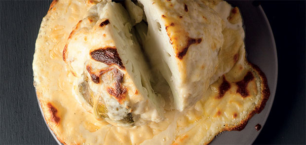 Heat 30 g butter in a medium-sized ovenproof casserole slightly larger than the cauliflower. Stir in 2 T flour until smooth. Gradually whisk in 1 cup milk and simmer, whisking, until thick and smooth. Whisk in 3 cups stock and ½ cup cream. Add a pinch of nutmeg, ½ t mustard and season to taste. Place the cauliflower in the centre of the casserole, rub the top with 1 T olive oil and season. Bake at 230°C for 20 minutes, then reduce the heat to 200°C and bake for a further 20–30 minutes, or until browned and tender. Check the seasoning. Serve from the casserole, dishing up portions of cauliflower along with the soup. Serve with hot pasta and a sprinkling of Cheddar. Try the whole roasted cauliflower soup recipe (pictured) here.