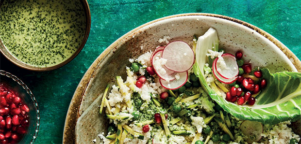 Simply cut 2 small heads of cauliflower into florets and (dry) blend until fine. Try the coconut-dressed cauli-rice winter salad (pictured above) here.