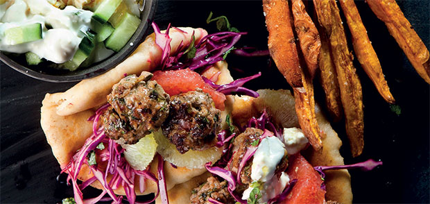 Fill the pitas with cabbage slaw, lamb meatballs and yoghurt dip. Serve with sweet potato fries. Season sea salt and freshly ground black pepper and finish with a drizzle of lime juice. Try the lamb meatball gyros with cabbage slaw and yoghurt dip recipe here.