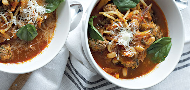 Try the herbed tomato-vegetable soup with spaghetti and meatballs recipe here.