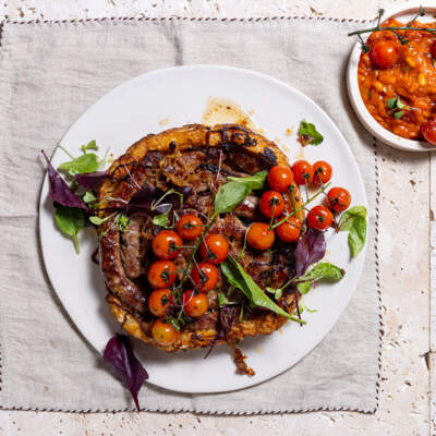 7. Lay out one sheet of phyllo pastry on a clean, flat surface. Brush it lightly with Tarka. Place another sheet on top and repeat the process until you have used all your sheets. Scrunch up the sheets and lay on top of potatoes.