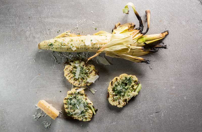 To make Grana Padana mielies and cauliflower, parcook 2 cobs corn and thickly slice 1 small head cauliflower. Mix chopped coriander and basil with grated Grana Padano and butter. Grill the corn and cauli ower over medium coals, basting with the butter until cooked to your liking. Serve sprinkled with extra Grana Padano