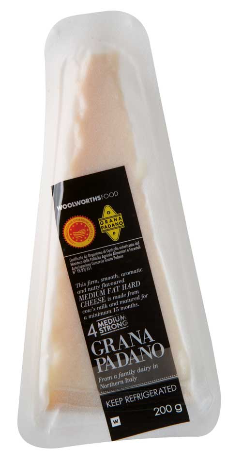 Grana Padano uses high-quality raw cow's milk cooked in copper cauldrons and aged for 15 months. The result is a cheese with a delicate, crumbly texture and mild, nutty flavour. Look out for the lozenge design or round red logo to be sure you're buying the real deal.