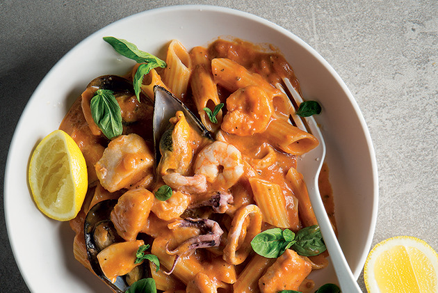 Simply, prepare Woolies' Easy to Cook seafood mix with tomato cream sauce according to package instructions. Toss with cooked penne and serve with a squeeze of lemon juice and fresh torn basil leaves.